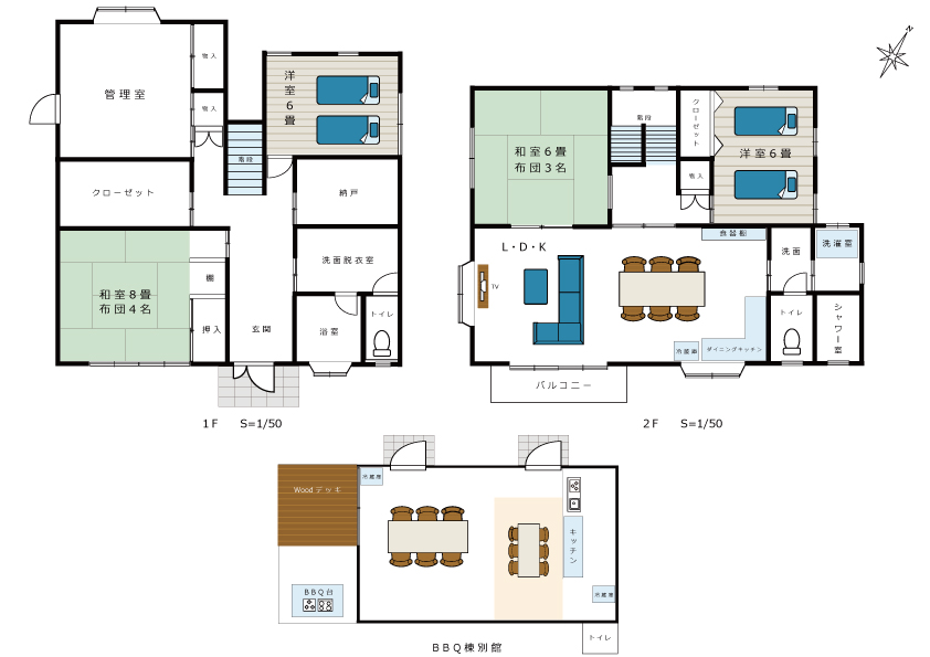 1階:キッチン(調理器具付)、カフェエリア、バーベキューエリア